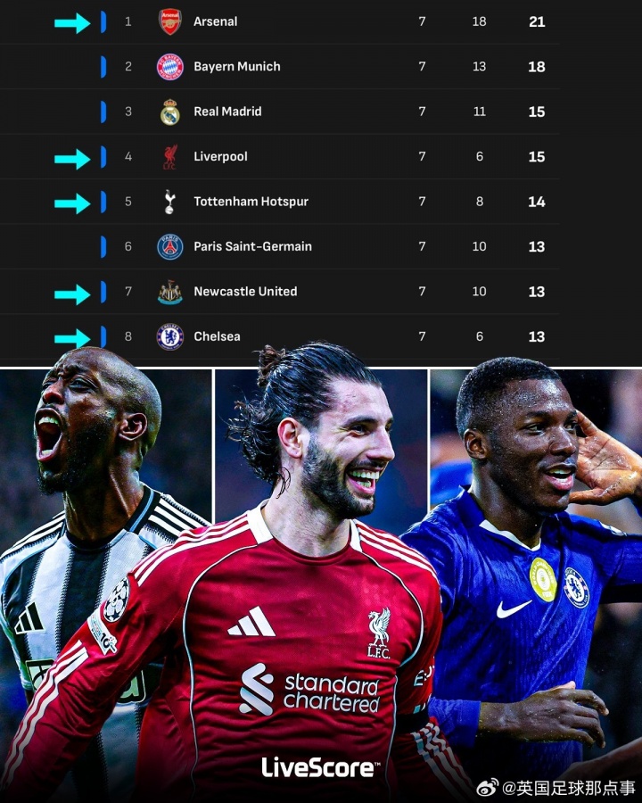 欧冠联赛阶段还剩最后一轮,积分榜前8名中英超球队占据5席!掌握直通淘汰赛主动权💪🏴