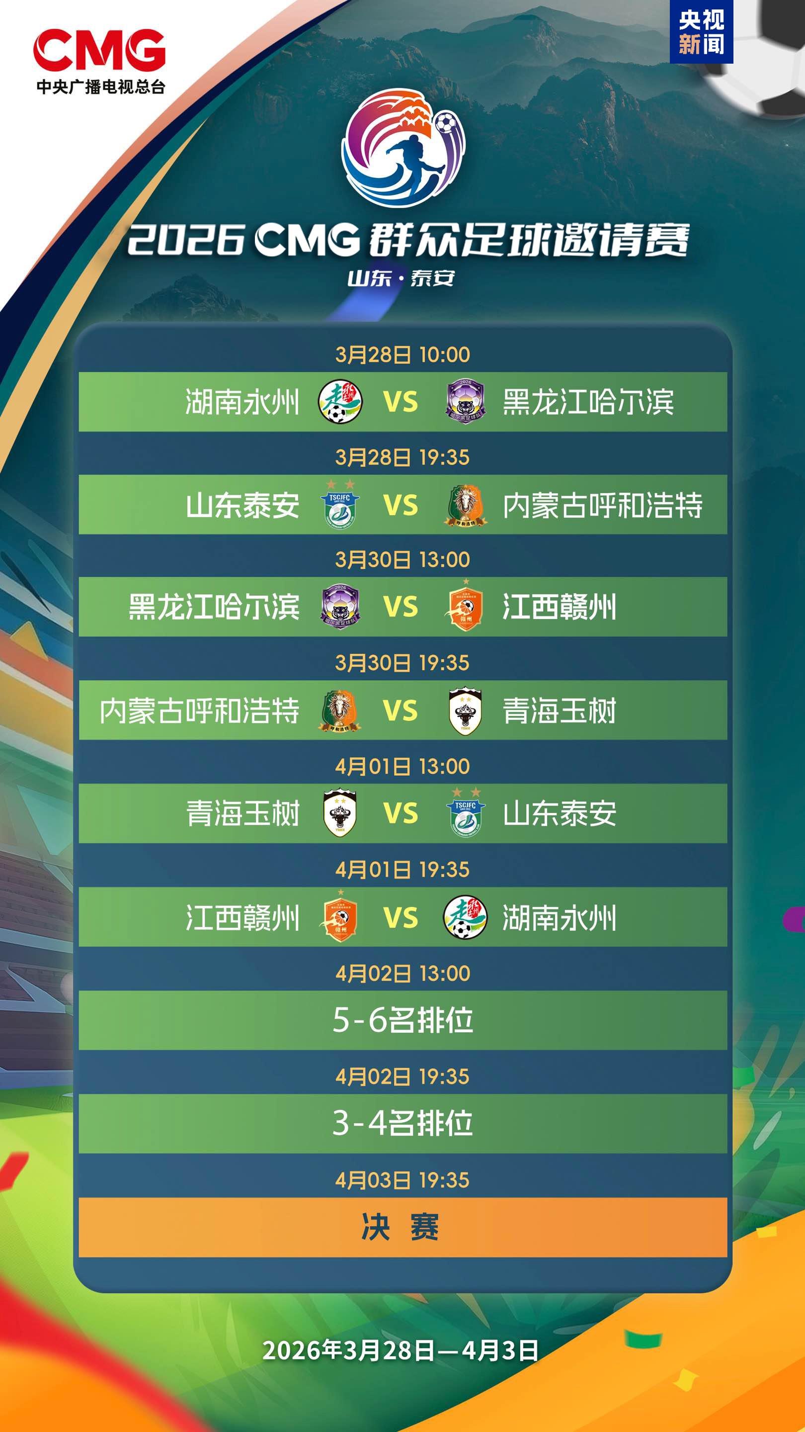 3月28日至4月3日,2026CMG群众足球邀请赛第二站将在山东省泰安市举行。