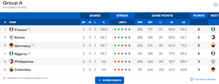 韩国女篮所在的A组当中,法国女篮、德国女篮与尼日利亚女篮均已经提前晋级女篮世界杯正赛,菲律宾女篮与哥伦比亚女篮均是0胜3负。韩国女篮2胜1负排在A组第二,她们距离晋级女篮世界杯一步之遥,下一场对阵0胜3负的菲律宾女篮取胜即可晋级。